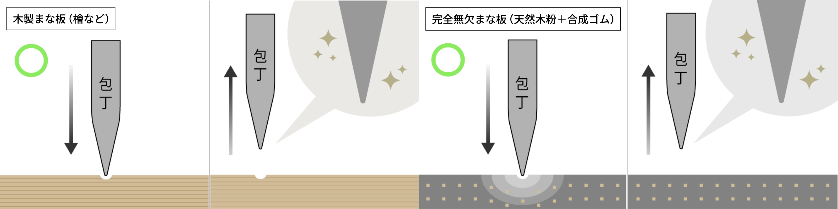 完全無欠まな板では、接する際の摩擦抵抗を限りなく少なくすることで、包丁の切れ味を長持ちさせます。
