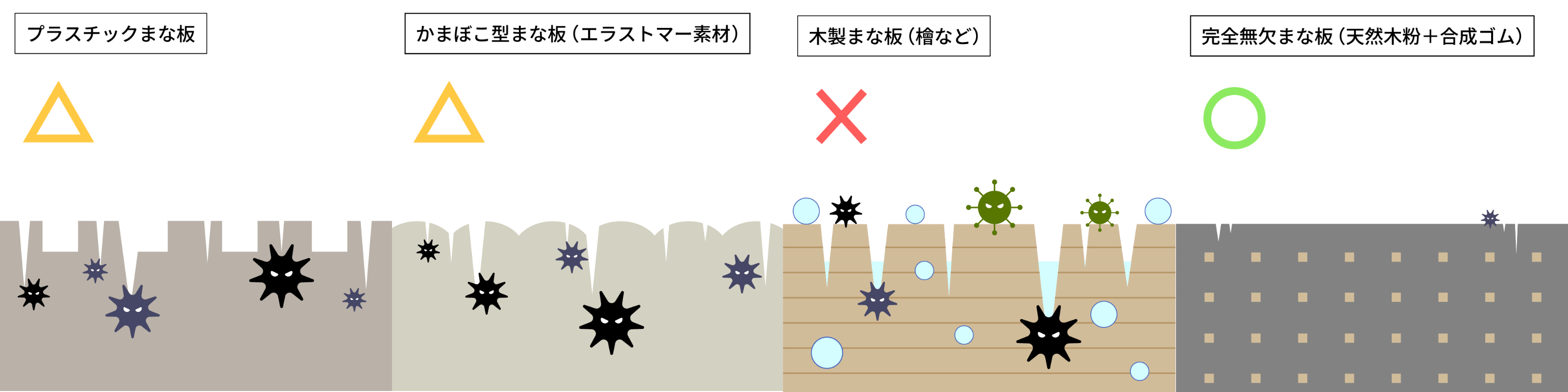 また、肉・魚などの水分をまな板が吸収することで、菌の繁殖やカビの原因になることが多いです。