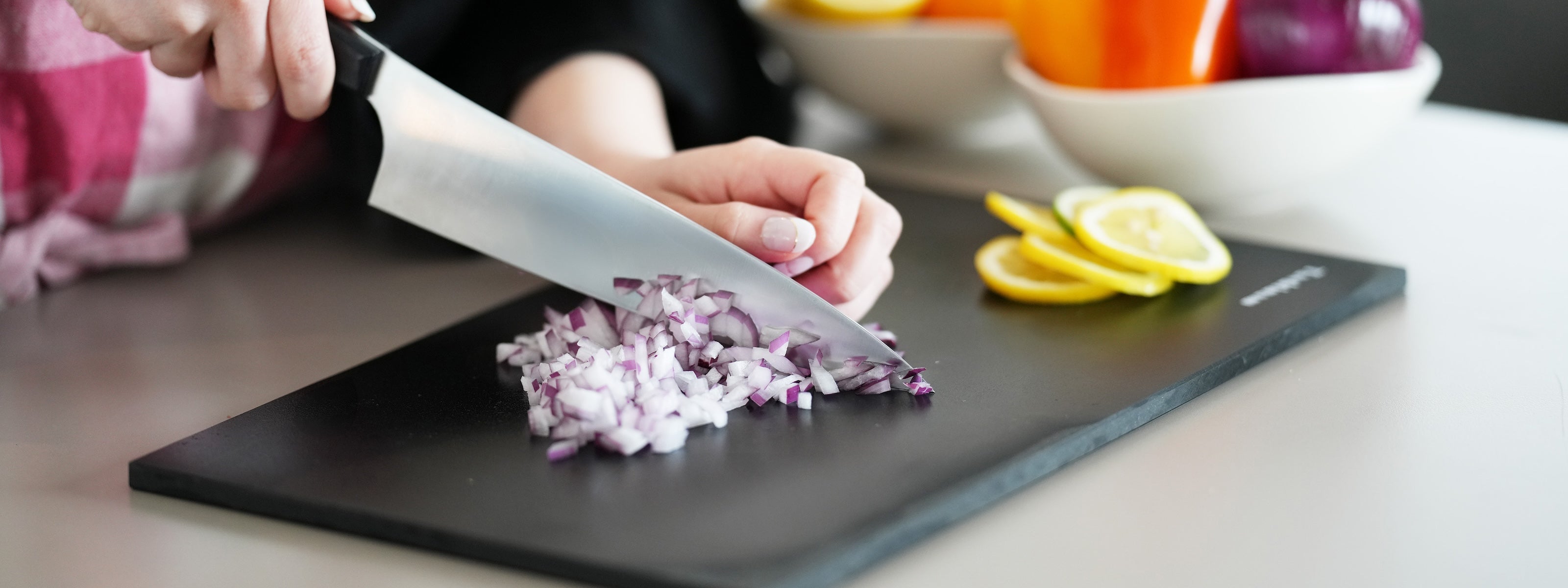 完全無欠まな板は、食材の彩りが美しく映るよう「黒」に染色しております。