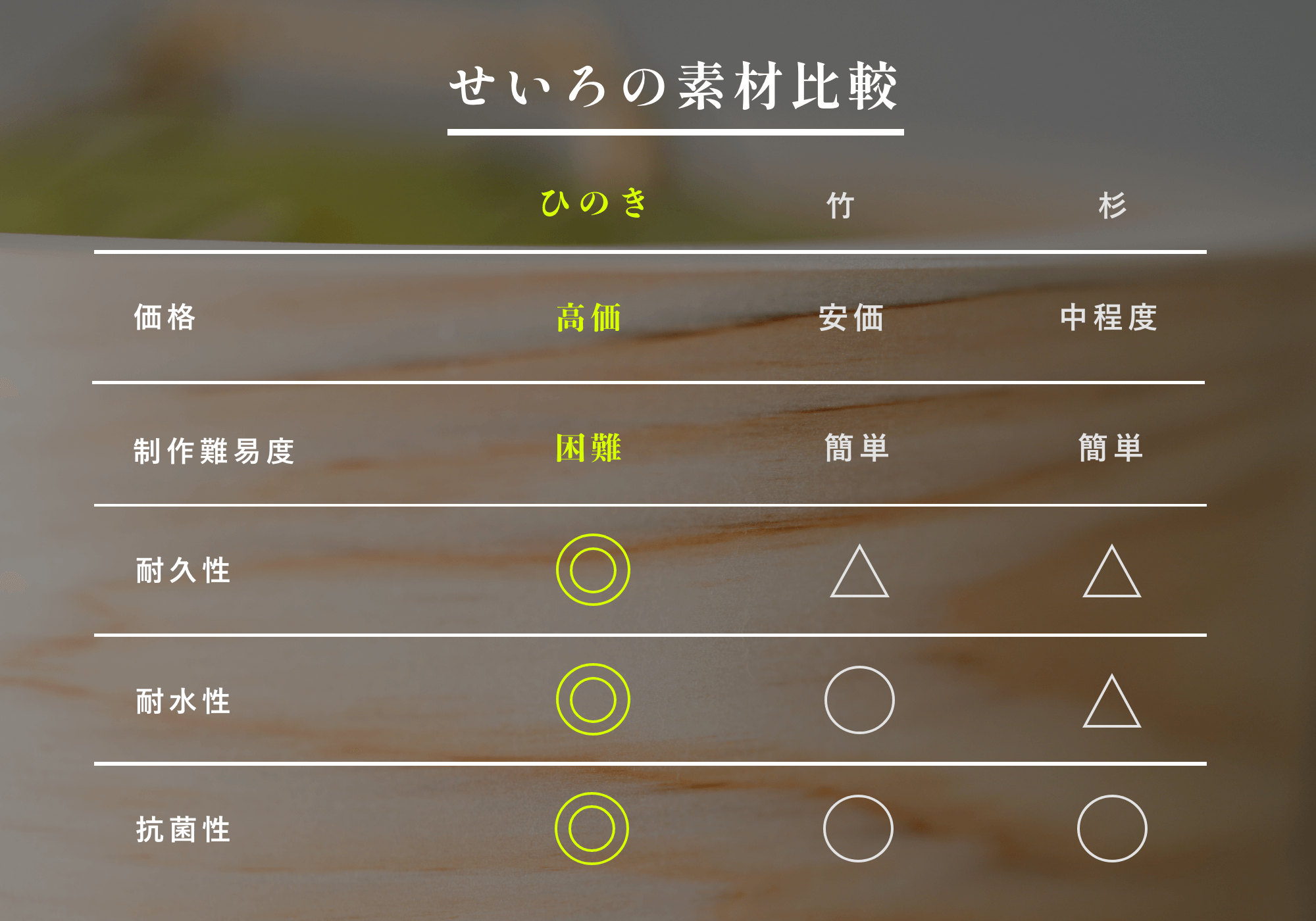 「ひのき」は、せいろで使用される木材の中で、耐久性・耐水性・抗菌性のすべてにおいて最も優れた高級素材です。