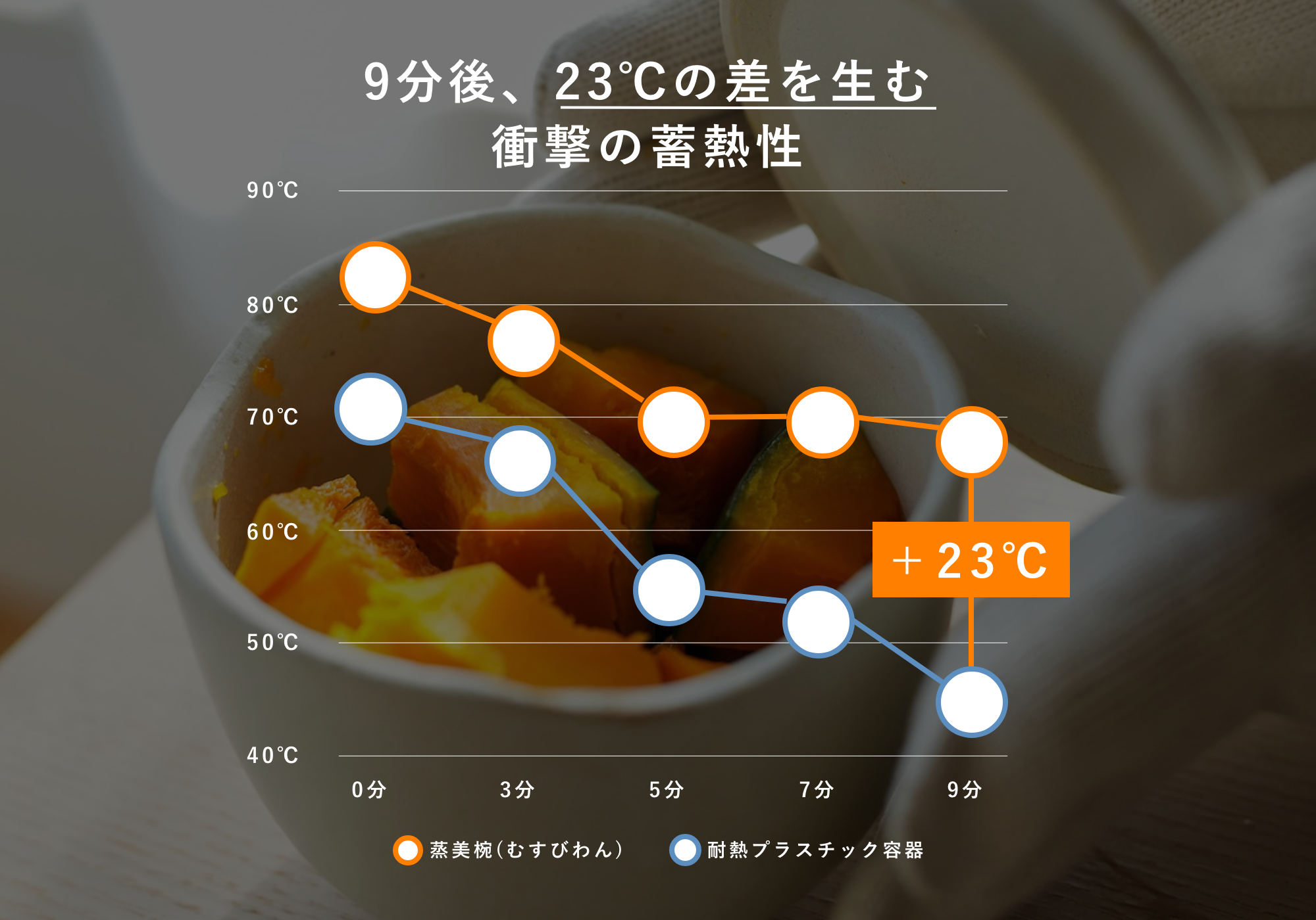 9分後、耐熱プラスチック容器の中身は45℃まで冷めていたのに対し、蒸美椀(むすびわん)はまだ68℃を保っていました。