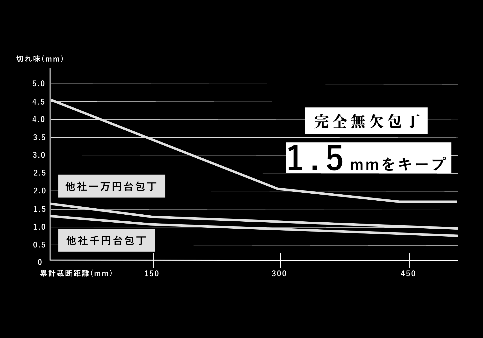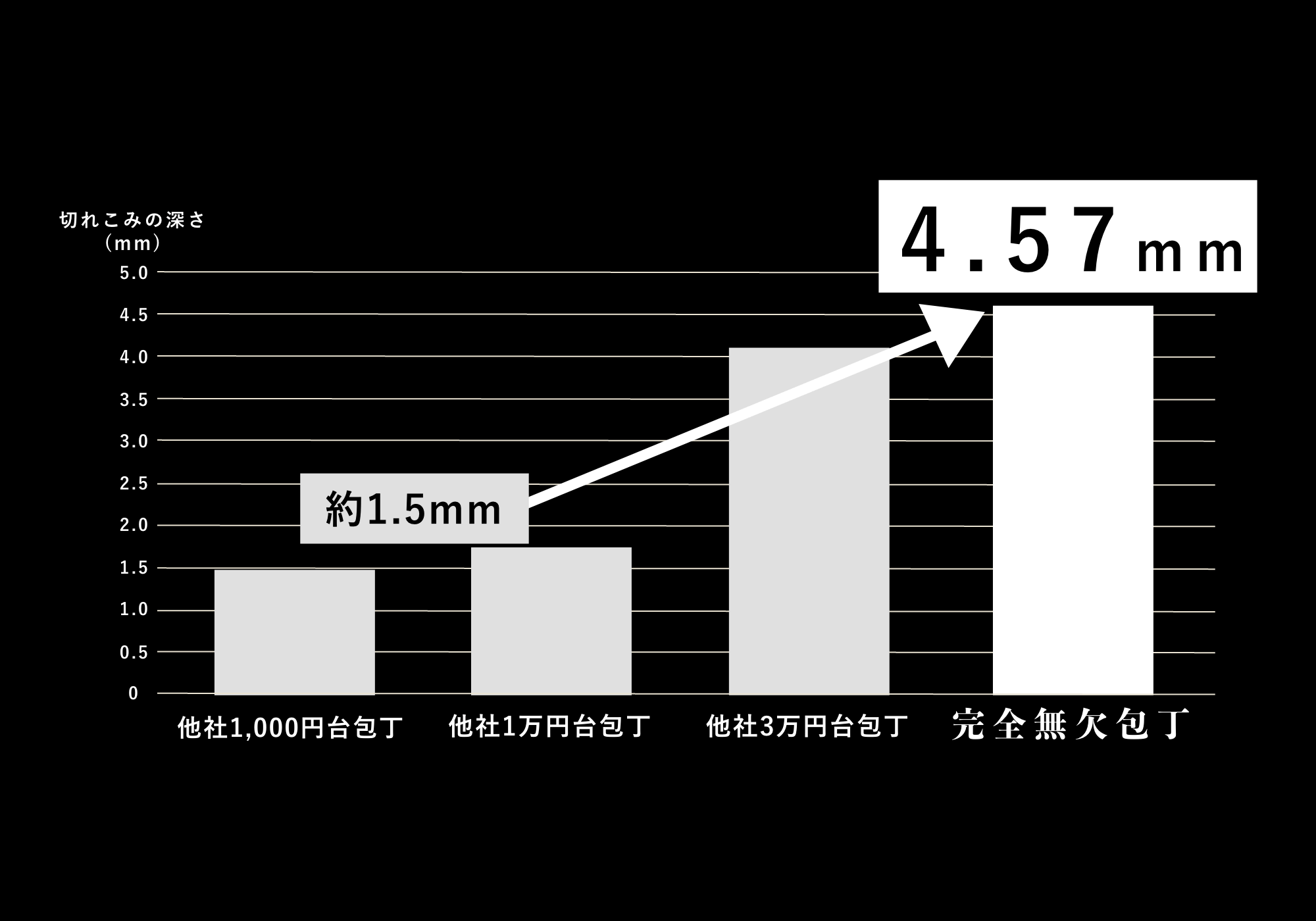 完全無欠包丁の切れ味を他社製品と比較試験したところ、切れ味の差が約3倍あり、同価格帯の他社包丁と比較してもそれを上回る切れ味があることが判明。