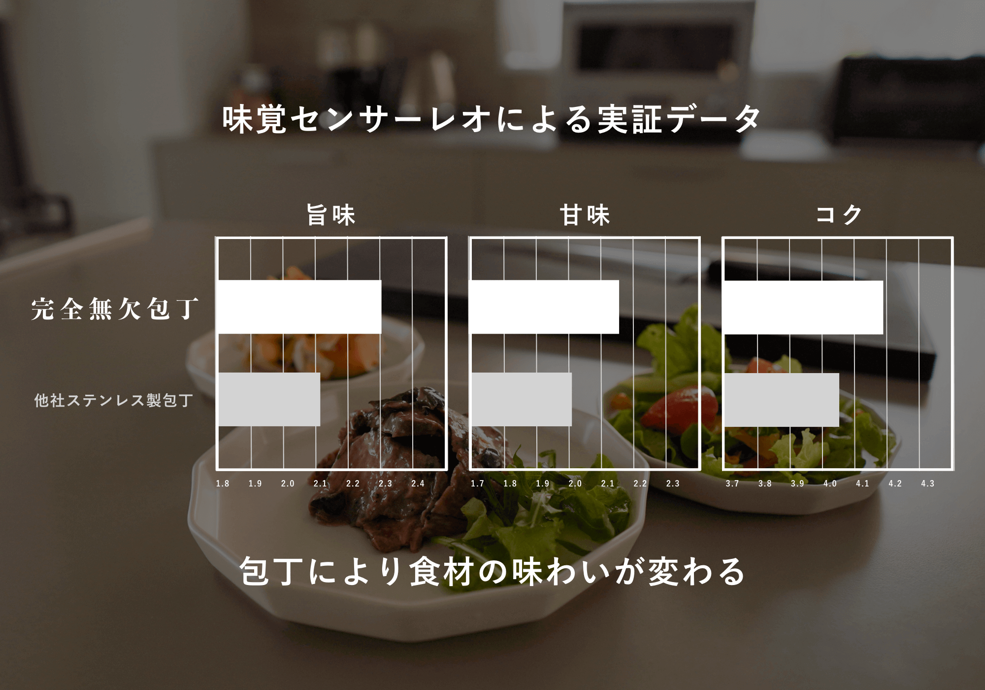 完全無欠包丁と中価格帯ステンレス包丁、2本の包丁によってトマトを切り、それぞれの味わいの変化を分析したところ、旨味は95%、甘味・コクは75%以上の人が気づくほど、味わいに優位な差が、完全無欠包丁によって現れることが証明されました。